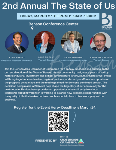 Join the Benson Chamber of Commerce for a special luncheon and briefing on the current direction of the Town of Benson. As our community navigates a year marked by historic industrial investment and critical infrastructure initiatives, this ?State of Us? event will bring together civic leaders, regional partners, and county staff to share updates on the progress being made and the roadmap ahead for Benson?s continued growth. The decisions being made in 2026 will help shape the trajectory of our community for the next decade. This luncheon provides an opportunity to hear directly from local leadership about how Benson is working to balance new economic opportunities with the quality of life that makes our town such a special place to live, work, play and do business.